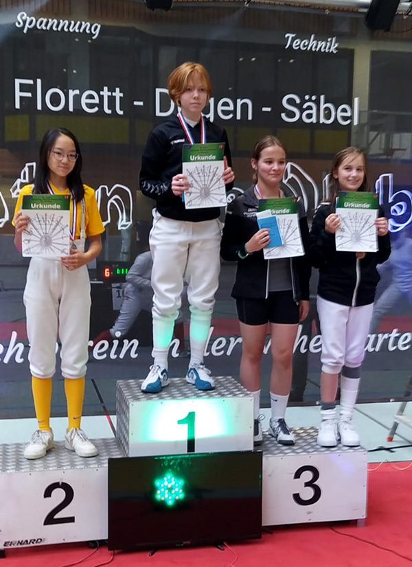 Bei den Marburger Stadtmeisterschaften am 19. November räumten die Florettfechterinnen des TV1862 Langen richtig gut ab. In der Gruppe U13 trat Lina Hülse gegen zehn weitere Sportlerinnen an. Nach einer guten Vorrunde mit drei Siegen und zwei Niederlagen hatte Lina zunächst ein Freilos und traf im Viertelfinale auf Luisa Trusheim von der SKG Oberhöchstadt. Das Gefecht konnte Lina mit 10:2 klar für sich entscheiden. Im Halbfinale traf sie dann auf Antonia Colsman vom TV Jahn Siegen, musste sich der späteren Turniersiegerin zwar mit 6:10 geschlagen geben, konnte sich aber verdient über den Bronzeplatz freuen.